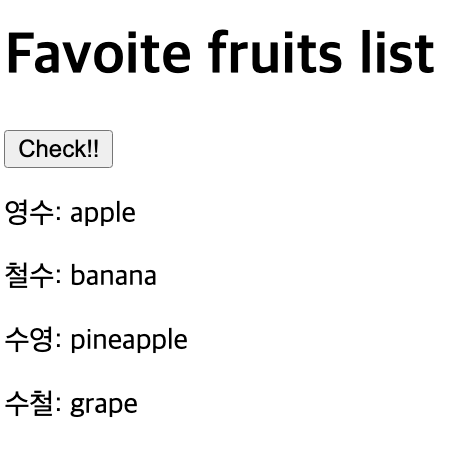 - Check!! ๋ฒํผ ๋๋ฅด๋ฉด fruits ๋ฐฐ์ด ์์ ์์๋ค์ด ์ถ๋ ฅ๋๋๊ฑธ ํ์ธํ ์ ์๋ค.
