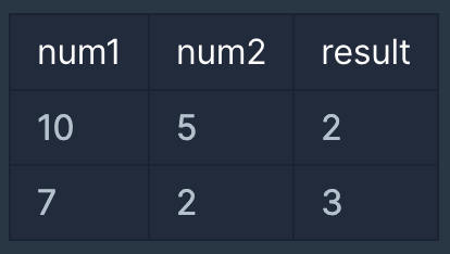 - num1 -> 10, num2 -> 5, return ๊ฐ -> 2