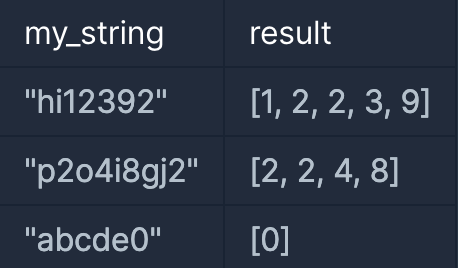 - ๋ฌธ์์ด my_string์ด ๋งค๊ฐ๋ณ์๋ก ์ฃผ์ด์ง ๋, my_string ์์ ์๋ ์ซ์๋ง ๊ณจ๋ผ ์ค๋ฆ์ฐจ์ ์ ๋ ฌํ ๋ฆฌ์คํธ๋ฅผ returnํ๊ธฐ