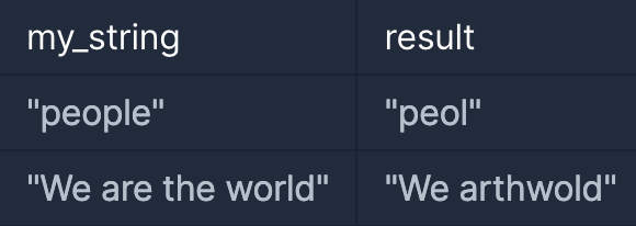 - ๋ฌธ์์ด my_string์ด ๋งค๊ฐ๋ณ์๋ก ์ฃผ์ด์ง๊ณ , my_string์์ ์ค๋ณต๋ ๋ฌธ์๋ฅผ ์ ๊ฑฐํ ํ ํ๋์ ๋ฌธ์๋ง ๋จ๊ธด ๋ฌธ์์ด์ return
