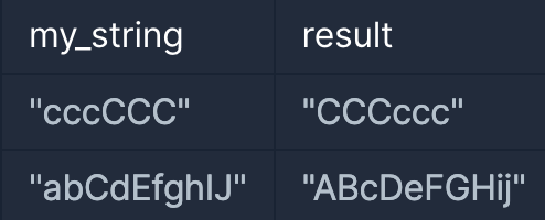 - ๋ฌธ์์ด my_string์ด ๋งค๊ฐ๋ณ์๋ก ์ฃผ์ด์ง ๋, ๋๋ฌธ์๋ ์๋ฌธ์๋ก ์๋ฌธ์๋ ๋๋ฌธ์๋ก ๋ณํํ ๋ฌธ์์ด์ return
